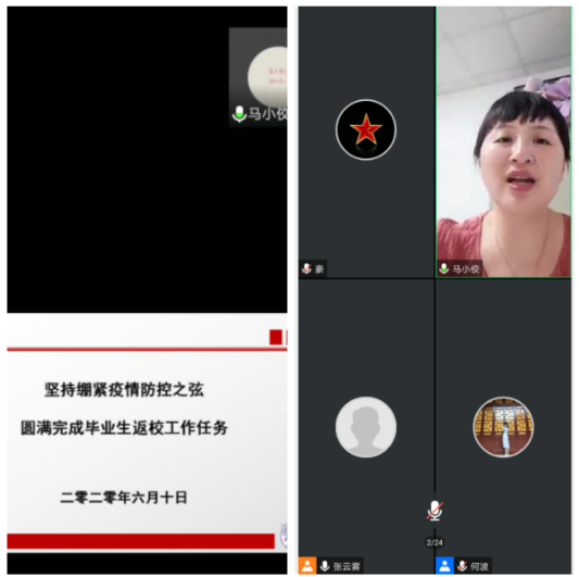 毕业生返校办理离校手续的组织分工、时间安排、办事流程进行了逐一讲解。辅导员张云雾老师则从学生返校前、返校中、返校后的具体准备工作和注意事项进行了宣讲,提醒返校学生加强安全防范,遵守校纪校规,高效办理离校手续。毕业生们还就毕业生离校手续清单办理流程、在校期间饮食、行李托运等具体事项进行了咨询,学院老师进行了线上解答。