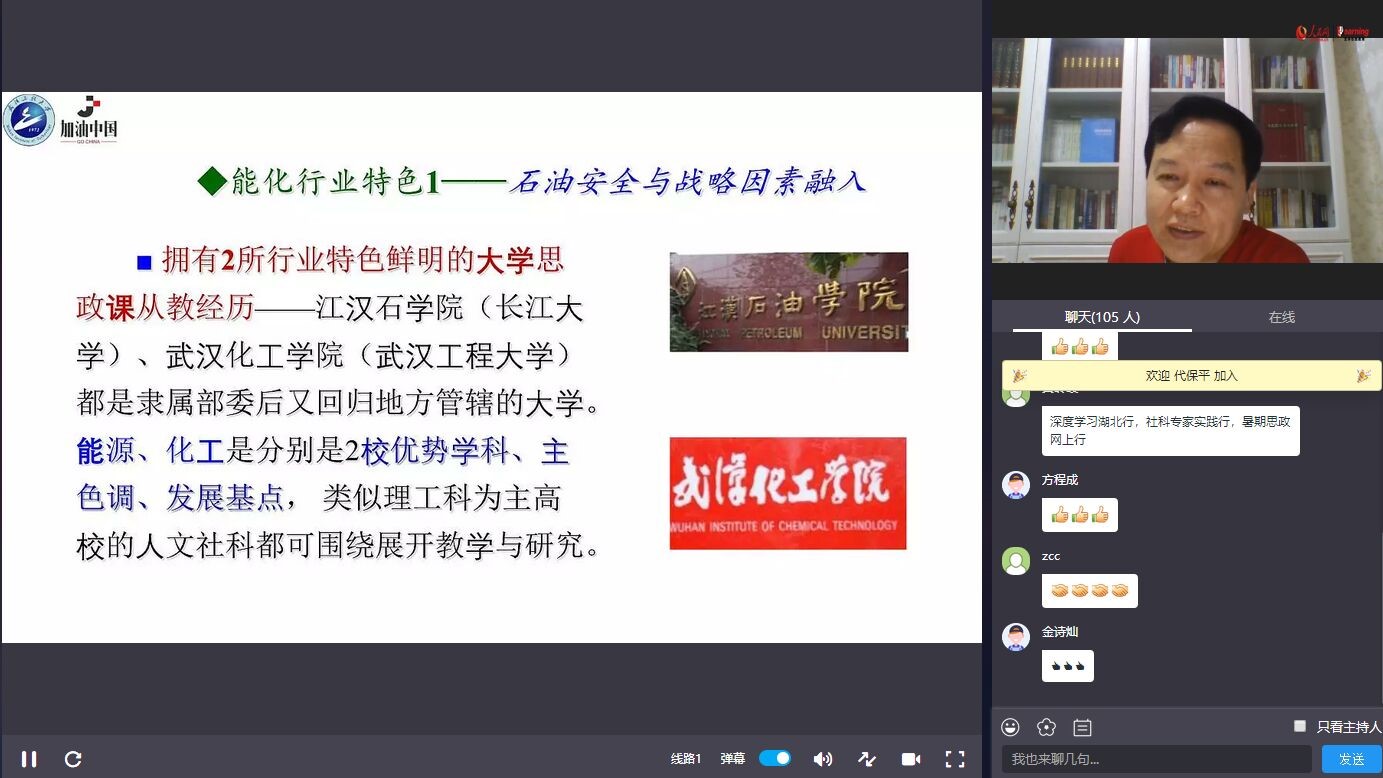 党委书记、国家精品视频公开课《谁来给中国“加油”——中国石油安全的困境与出路》主讲人、“加油中国”课程负责人舒先林教授,讲座主题为“如何将行业特色融入思政课?——以武汉工程大学‘加油中国’为例”。