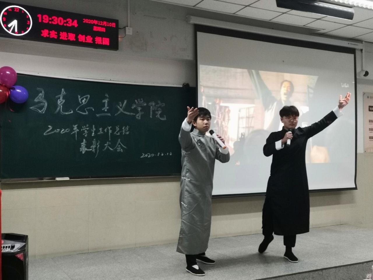 在12教202室举行了2020年学生工作总结表彰大会。学院党委书记吴智勇、党委副书记马小佼、青年教师谭梦媛、学工办主任张云雾、辅导员李敏和学院全体在校学生参加了活动。