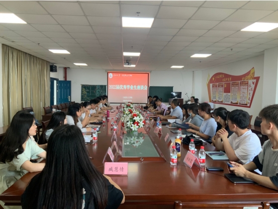 在文科楼1104室召开2022届优秀毕业生座谈会,本次会议由辅导员张云雾主持,院党委书记刘小燕、副院长涂江波、院长助理李振华、研究生导师代表黄晓云、本科生班主任代表汤波兰、辅导员李敏与19位本、研优秀毕业生共聚一堂话别离。