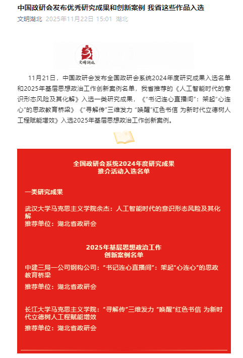 《“寻解传”三维发力“唤醒”红色书信 为新时代立德树人工程赋能增效》案例,入选中国政研会2025年度基层思想政治工作创新案例,系湖北省仅有的两个入选案例之一,也是我省唯一入选的高校案例。