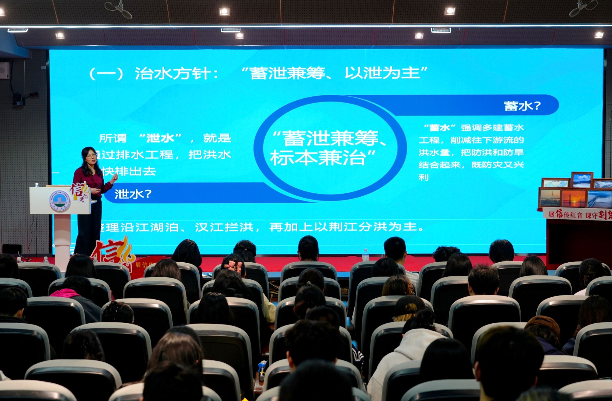副教授肖芬蓉老师与学生代表王迎悦、吕冬丽联袂主讲。从社会主义革命和建设时期“除水害、兴水利”的“安澜信”到改革开放和社会主义现代化建设新时期“建枢纽、促发展”的“开发信”,再到中国特色社会主义新时代“生态优先、绿色发展”的“守护信”,三封信串联起中国共产党领导长江治水的奋斗征程与辉煌成就,生动展现不同历史时期治江方略的传承与创新,深刻阐释“人民至上、科学决策、改革创新、久久为功”的治水智慧与“万众一心、众志成城,不怕困难、顽强拼搏,坚韧不拔、敢于胜利”的抗洪精神内核。