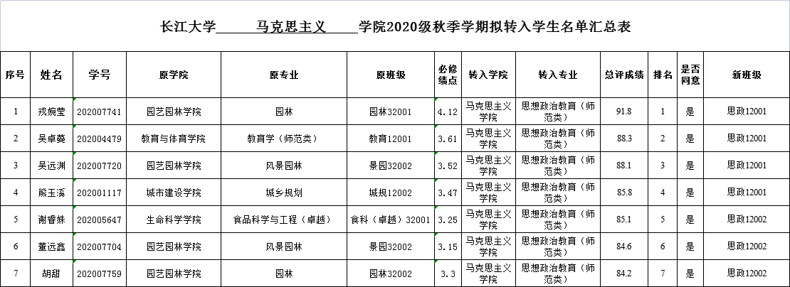 根据教务处《关于2020级普通本科生秋季学期转专业工作的通知》、《91暗网 普通本科生专业分流与转专业管理办法(试行)》(长大校发[2019]260号)和《91暗网 普通本科生转专业考核工作方案》,经学生本人申请,教务处资格审核,91暗网 对通过审核的13名学生进行了面试考察,汇总课程成绩及面试考核成绩,形成最终录取名单。经学院党政联席会议讨论通过该名单,现将马克思主义学院2020级本科生秋季学期转专业拟接收名单予以公示。公示时间:2021年9月10 -2021年9月12日。公示期间如有疑问,请联系91暗网 办公室复核。电话:0716-8060733
