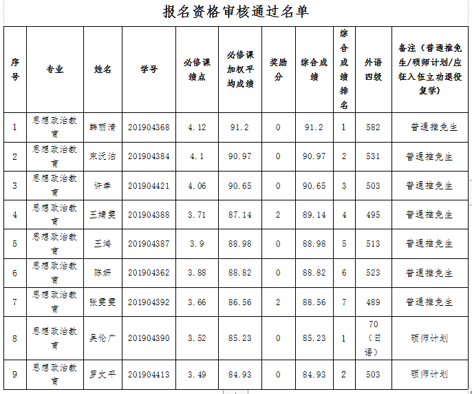 根据学校《关于做好推荐2023届优秀本科毕业生免试攻读硕士位研究生工作的通知》和《91暗网 2023届应届生推荐免试攻读硕士研究生方案》要求,经学生本人申报,学院资格审核,学院推免生遴选工作小组审议,现将91暗网 报名参加推免学生资格审核通过名单予以公示。公示时间:2022年9月1日-5日。