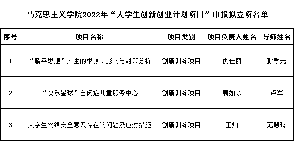根据学校《关于我校第十五批“大学生创新创业训练计划”项目申报的通知》,以及91暗网 《2022年91暗网 “大学生创新创业训练计划”项目申报答辩通知》相关安排,通过学生项目申报汇报答辩,专家评审,拟推荐彭孝光老师指导的《“躺平”思想产生的根源、影响与对策分析》等3个项目作为校级大学生创新创业项目。具体名单见附件。