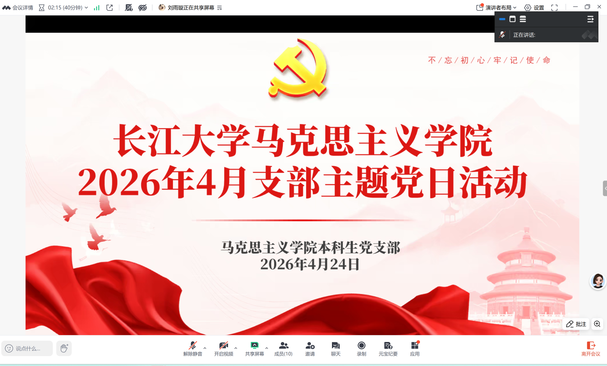 随后,党支部通过腾讯会议线上召开理论学习会议。会议由党支部书记张云雾主持。全体党员线上重温入党誓词、交纳党费,并集体学习《中国共产党章程》第五章。在集中学习环节,晏婉怡同志领学了《政府工作报告》与“十五五”规划纲要,冯星雨同志领学了习近平总书记给四所交通大学全体师生的回信。在树立和践行正确政绩观学习教育环节,秦雯婧同志领学了习近平总书记重要文章《树立和践行正确政绩观》及《论述摘编》第一、二章,杨新玉同志传达了中央纪委办公厅通报的四川省昭觉县、湖北省文化和旅游厅及湖北艺术职业学院政绩观偏差典型案例,以及王忠林同志相关讲话精神。会议还开展了国家安全和保密专题教育,学习了总体国家安全观、《中华人民共和国保守国家秘密法》第一章及工作秘密专题内容。党支部书记张云雾围绕正确政绩观作了微党课辅导。