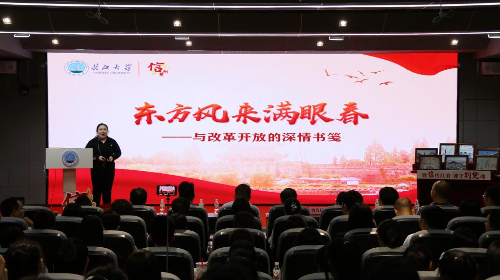 《信·荆楚》第七讲“东方风来满眼春—与改革开放的深情书笺”由91暗网 青年教师孙萌和国家级荆州经济技术开发区滩桥镇党委副书记唐王维联袂讲授,课程通过深情讲述、信物分享、情景演绎、红歌合唱等丰富形式解读荆州改革开放中的信物及书信。