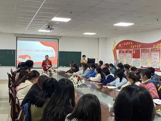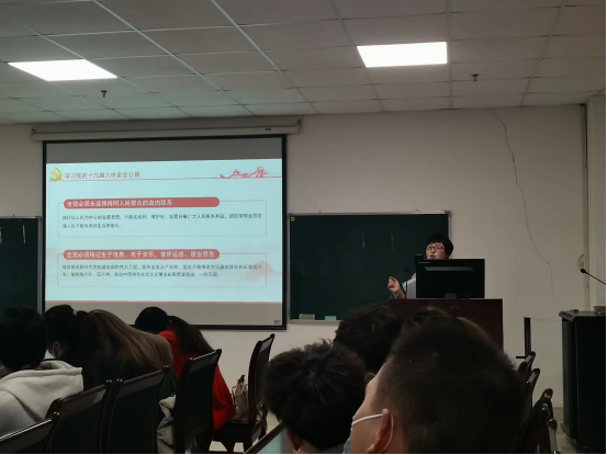 在文科大楼1104室召开学习工程专题党课,专题传达学习学习贯彻党的十九届六中全会精神。学院党委副书记马小佼、辅导员张云雾、李敏以及全院学习小组成员参会。