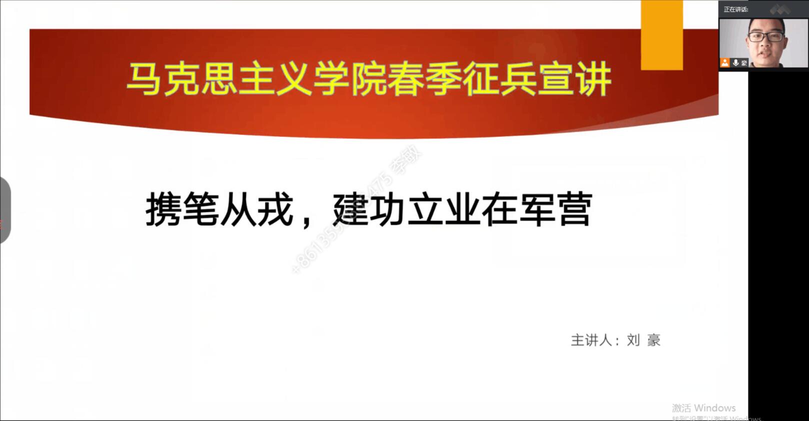 通过腾讯会议开展2020年春季征兵宣讲会。学院兼职辅导员、退役士兵刘豪主讲,学院全体男生和部分女生参加了宣讲。