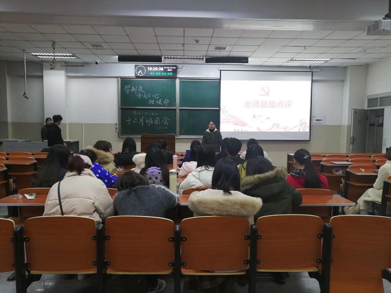 思政11801支部十二月团会主要是在室内开展,通过相关音频分享、主持人对我国现行制度和十九届四中全会的精神的详细讲解,以及相关知识竞答活动和同学代表发言,加深了同学们对我国国情和十九大四中全会精神的了解,坚定了不忘初心跟党走的信念,增强了同学们的时代使命感,取得了良好的效果。思政11802支部这次采用室外学习的方式开展团会,在活跃的气氛中,通过同学宣读十九届四中全会的知识,让每个参与者熟悉时政新闻,另外,由同学发表自己对四中全会精神的理解来引入学制度、守初心、担使命的教育主题活动,通过在活动中对《决定》内容的宣读,增进了对中央政策的理解,既是对当前社会成就的一种总结也是对未来中国社会前进目标的一个认识和强化,坚持中国制度,不忘初心、牢记使命,始终作有担当的中国青年人。