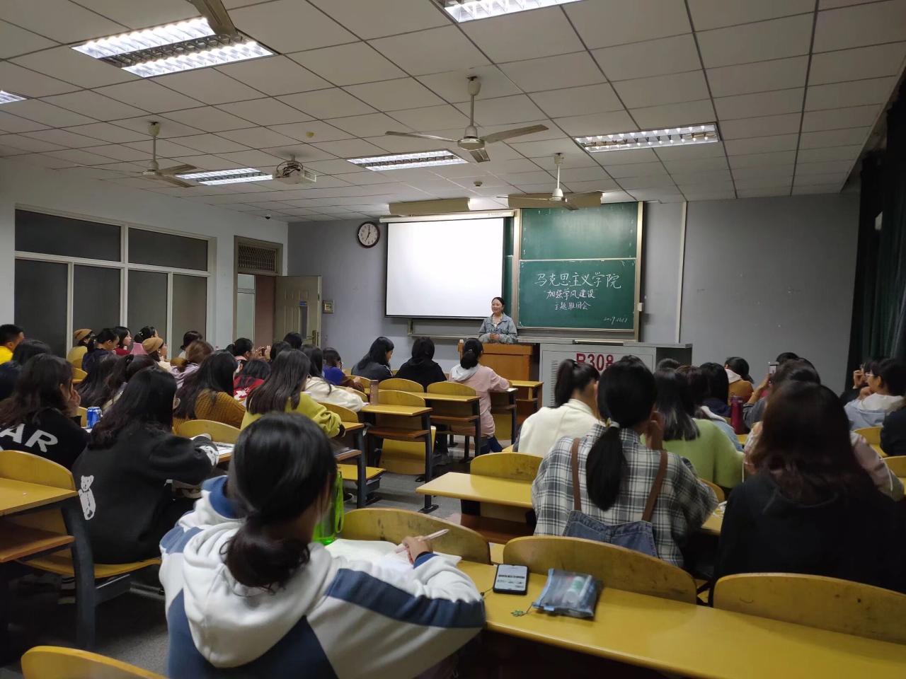 2019级新生在13教B308教室开展了“学风建设”主题班会。班会请了谭琴和崔婷两位高年级学生进行学习和工作方面的经验分享。全体大一同学参加班会。