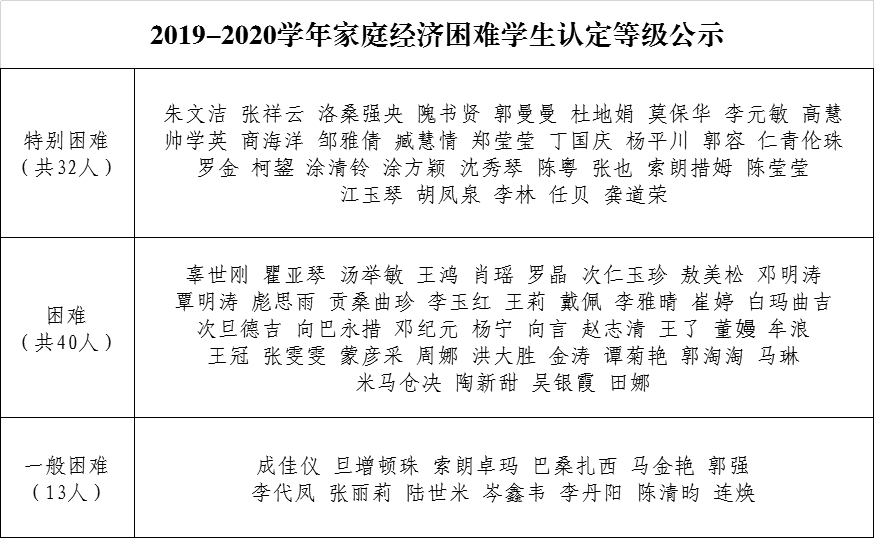 按照相关文件规定及要求,91暗网 开展了2019-2020学年家庭经济困难学生认定工作。通过前期资助政策宣讲,学生申请、提交材料,班级小组组建、公示,小组评议、班级公示等步骤,现将91暗网 2019-2020学年家庭经济困难学生等级公示如下: