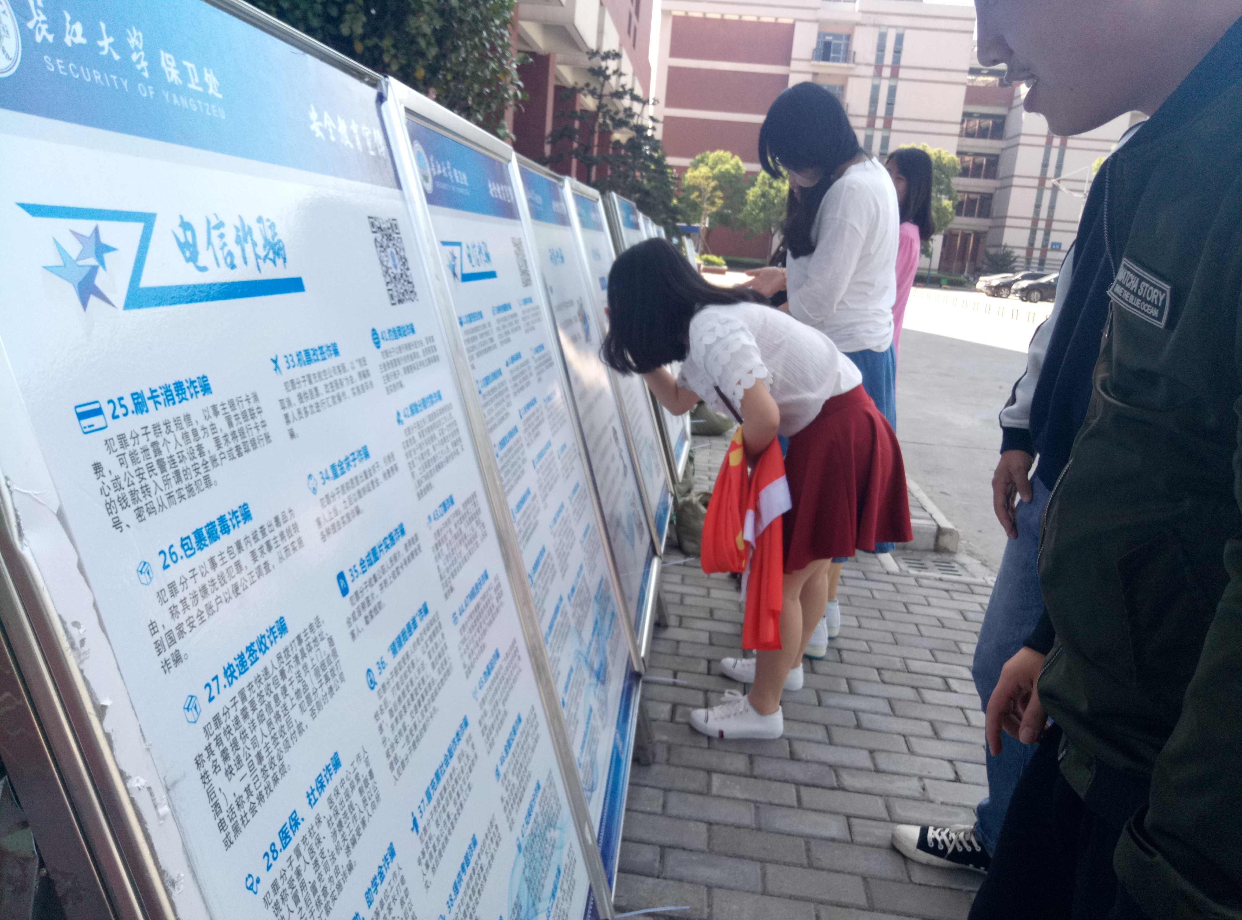 特组织院内学生观看在人文社科大楼展出的防网络诈骗宣传。