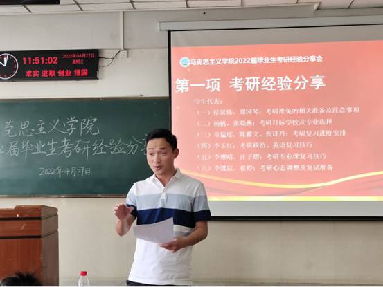 在12教203室举行2022届毕业生考研经验分享会。院党委副书记马小佼,辅导员张云雾、李敏,2022届考研学生代表、2019 级和2020 级本科生参会。