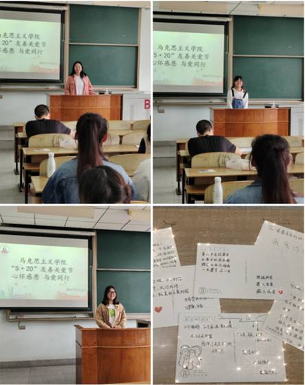 紧扣5月20日“我爱你”、5月25日“我爱我”寓意,通过明信片记录爱,大声说出爱,电影感悟爱,行动传递爱等丰富多彩,师生喜闻乐见的形式倡导学院学生关爱同学、关爱自身身心健康;鼓励学生向亲人表达感恩之情,汇报生涯规划;推进师生“1+1”特色导师育人制”资政育人工作。习近平总书记曾多次勉励青年人要勤学修德明辨笃实,成长为有“大爱大德大情怀”的时代新人。诚然,从爱自己、爱同学、爱家人开始,推而广之爱家乡、爱祖国、爱人民是从小爱到大爱的升华。毫不吝啬的大声说出爱,思政学子的眼中有星光,心里有大爱。