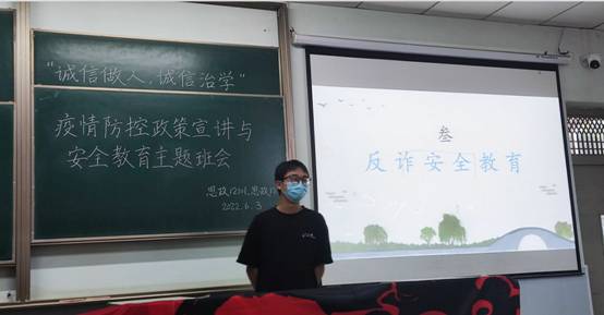 围绕防溺水安全教育和反诈教育,思政12101班、思政12102班开展了集中学习。思政12101班副班长于潇浚播放了安全教育微视频、宣讲了防溺水安全知识,班主任何波强调了“非必要不离校,出校必请假”的规定,重申了防溺水安全常识。思政12102班副班长吴佳庆宣讲了防诈骗知识和学生被骗的具体案例,辅导员张云雾老师在总结中再次强调了反诈的重点是做到“三不”,即不听、不信、不转账。
