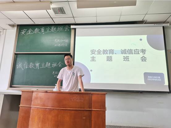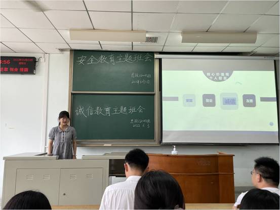 本次班会组织从防溺水安全教育、疫情防控教育、反诈骗安全教育、诚信应考及考风考纪教育四个方面进行开展。主讲人刘玉玲给大家播放了溺水事故相关视频并讲授了相关安全常识及溺水自救方法。并强调了学校疫情防控要求,督促同学们按时打卡、按要求进行核酸等。在安全教育部分的最后,大家一起学习了反诈骗相关知识,了解了诈骗团伙常用套路与相关反诈措施。主讲人王子怡向大家强调了诚信考试规范,带领同学们学习了91暗网