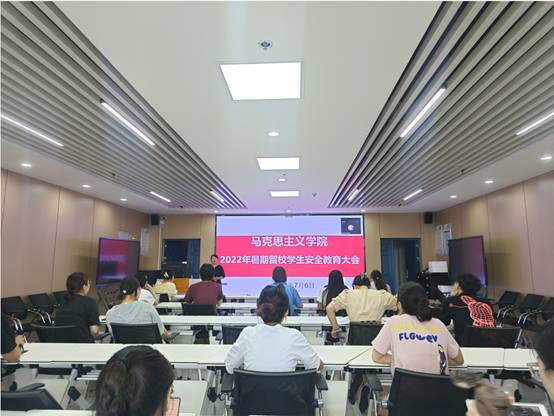 在文科大楼1008召开2022年暑期留校学生安全教育大会,院党委副书记马小佼、学工办主任张云雾及全体留校学生参与本次会议。