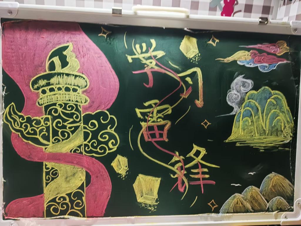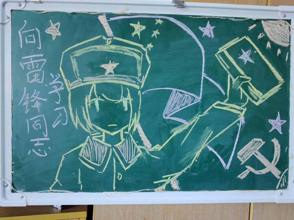 同学们拿起五彩粉笔,精心创作出一幅幅图文并茂的作品,饱含深情地表达对雷锋同志的敬仰之情。