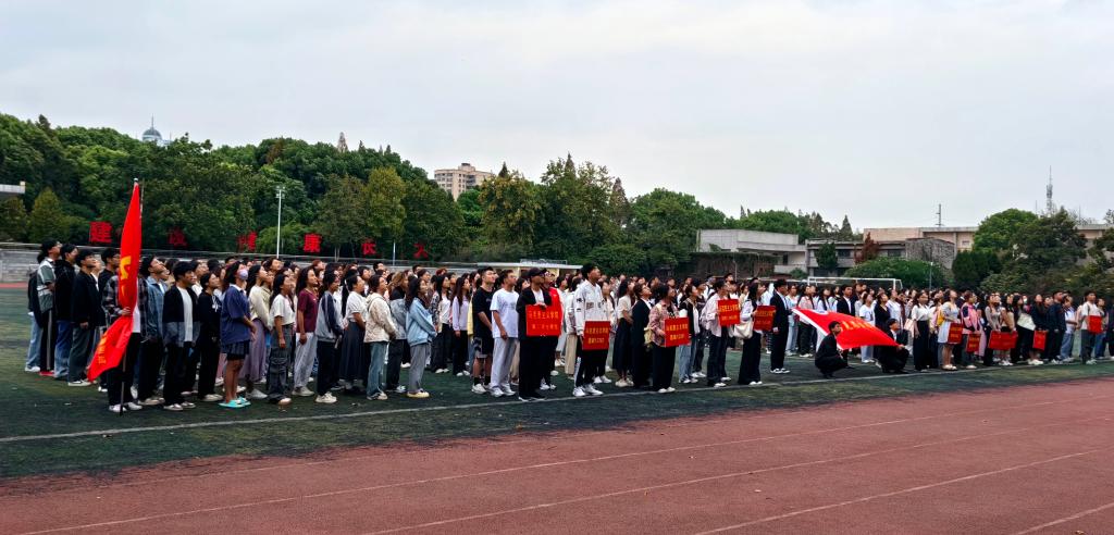 在东校区田径场举行“锚定青春航向,奋力挺膺担当”升旗仪式。学院党委副书记汤慧诊、学工办主任张云雾、兼职辅导员袁田以及全院本、研学生参加活动。