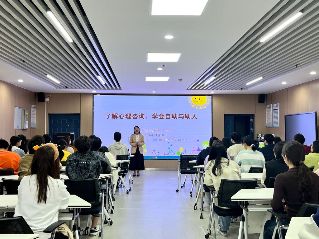 讲座伊始,张老师以目前青少年群体的心理健康状况为引,启发同学们的思考。她从“走进心理健康”、“认识心理咨询”、“学习心理援助”等方面进行了详细讲解,结合生动案例深入浅出地强调了科学的身心健康观、大学生常见心理问题的识别、心理危机应对方法等内容。她呼吁学生骨干学会自助与助人,并详细介绍了我校四级心理健康教育体系。