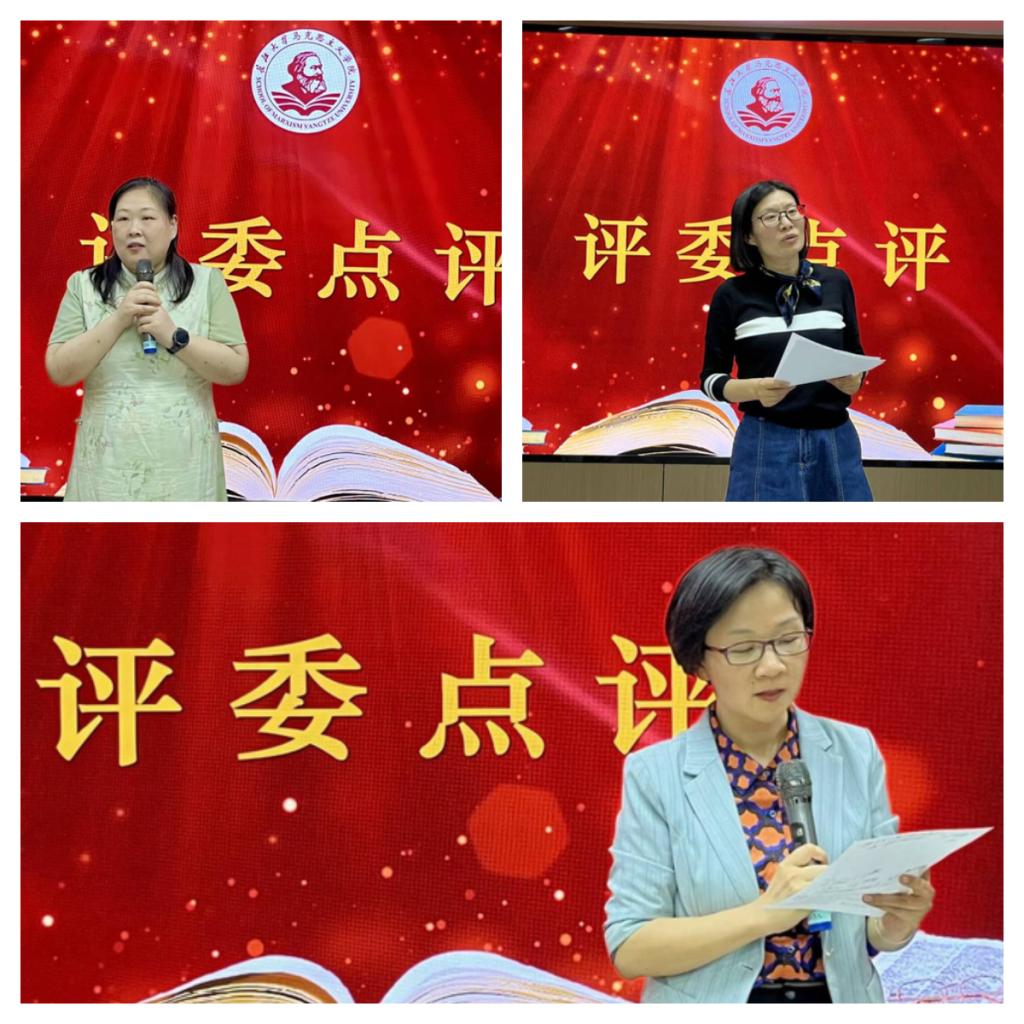 在评委点评环节,针对1—5号选手,郭辉老师用“古今中外”四个字,将这几本书的逻辑联系起来;她希望同学们通过读书“明典、明智”,把专业学习与课外阅读相结合,拓宽知识视野。针对6—9号选手,张莉老师从书籍选择、内容安排、ppt制作等方面逐一点评,勉励同学们持续阅读名著,把握内涵,强化批判性思维。刘小燕书记号召同学们多读经典原著,在品读经典中增长智慧、思考人生、淬炼品质,做新时代有为青年。
