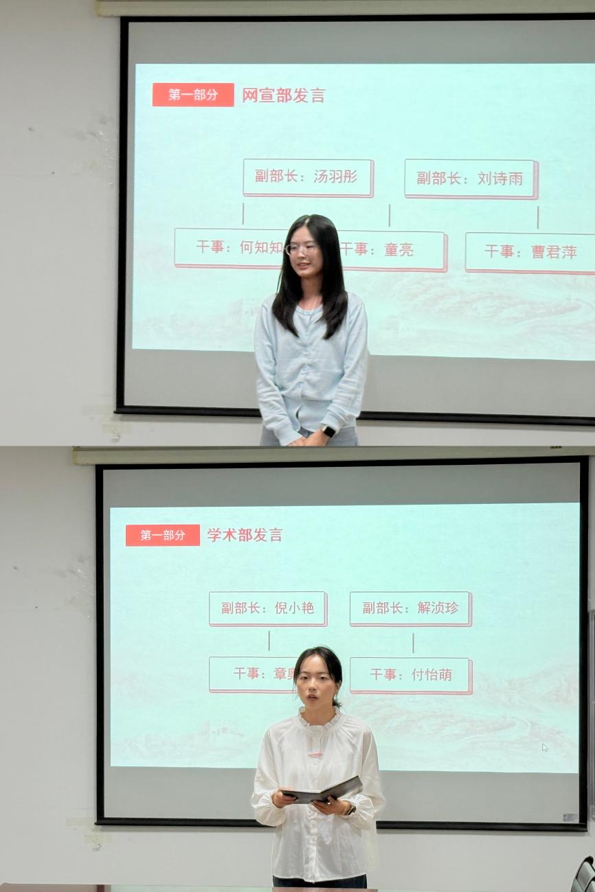 会议伊始,主席团成员程晨进行代表发言,总结了过去一年研学会在学术研究、志愿者活动以及文体活动等方面的工作,并希望新成员们积极发挥自身优势,为研学会的发展贡献自己的力量。