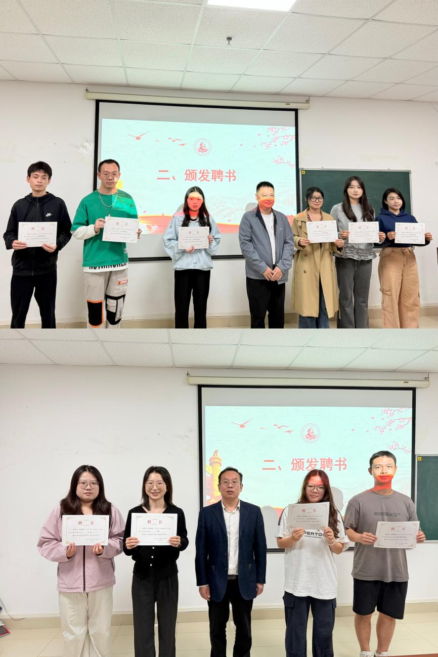 竺正海、邓鹏为第十届研究生会成员颁发聘书,表彰上一届研会成员的辛勤付出与卓越贡献。