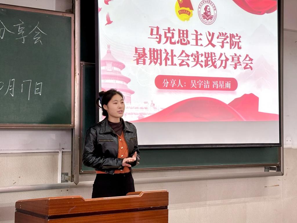 在主教307室举办“实践启新程,思想映时辉”暑期社会实践经验分享会。优秀实践学生代表冯星雨、吴宇洁及大一全体学生参会。