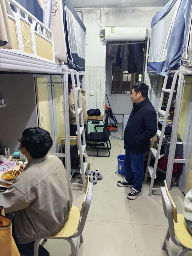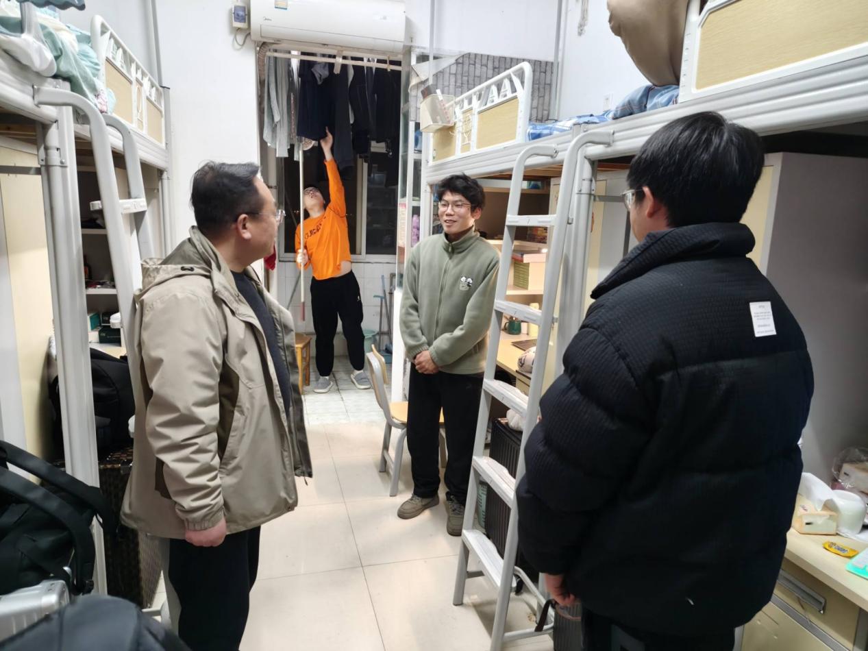 竺正海副书记、学工办主任张云雾老师、辅导员邓鹏老师深入学院本科及研究生宿舍开展查寝走访工作,重点排查宿舍安全隐患,细致了解学生生活近况,切实传递学院对学生的关怀与重视。 走访过程中,老师们逐一检查各宿舍的用电安全、卫生环境及物品摆放情况,重点排查违规电器、私拉电线等潜在安全风险,现场提醒同学们严格遵守宿舍管理相关规定,进一步增强安全防范意识,自觉养成良好的宿舍生活习惯。