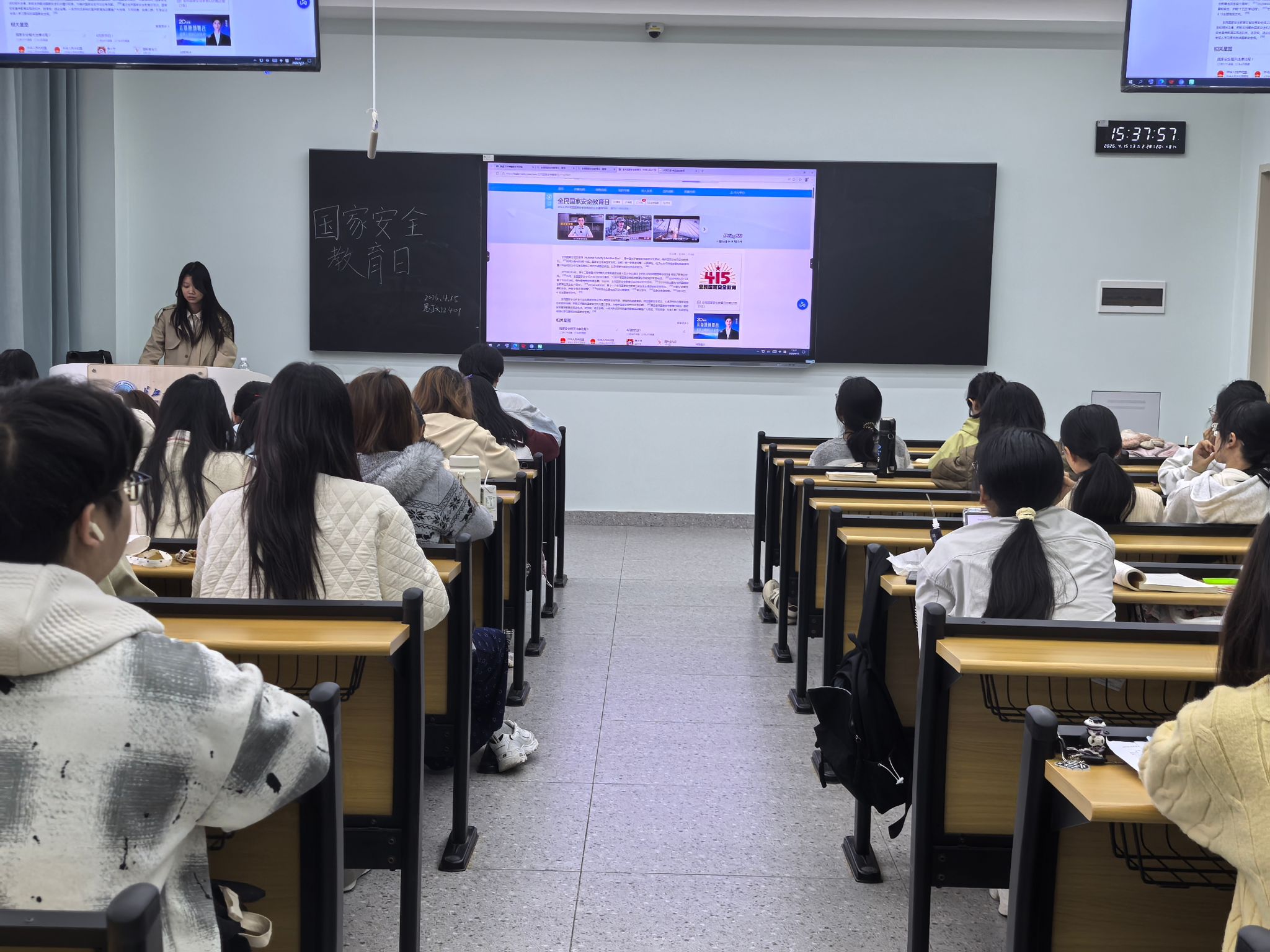 活动中,全体学生集中观看了教育部“千万师生同上一堂国家安全教育课”公开课。课程系统阐释了总体国家安全观的科学内涵与时代价值,并结合典型案例,深入浅出地讲解了政治安全、网络安全、生物安全等重点领域面临的现实挑战与应对策略,帮助同学们更加直观、深刻地认识当前国家安全形势的复杂性与严峻性。