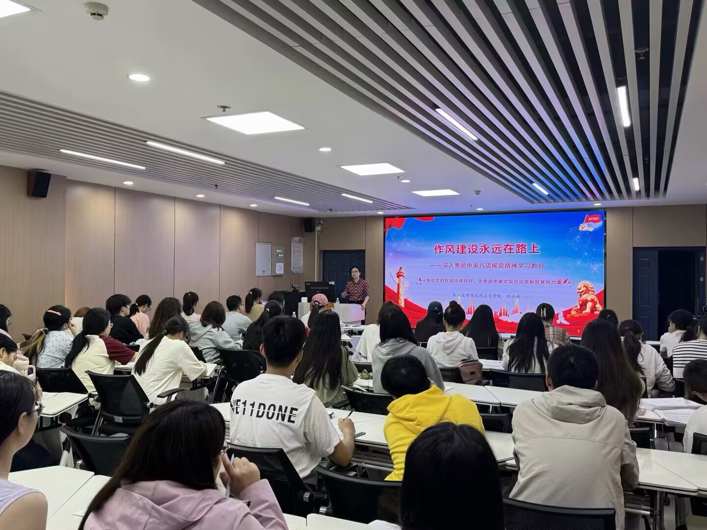 刘书记以《作风建设永远在路上——深入贯彻中央八项规定精神学习教育》为题,作专题辅导。她从开展本次学习教育的重大意义、新时代党的作风建设的内涵和特征、违反中央八项规定精神的主要表现及对应的党纪条规、新时代党的作风建设成效的启示、以过硬作风保障事业高质量发展等方面,对深入贯彻中央八项规定精神学习教育作了深入解读。
